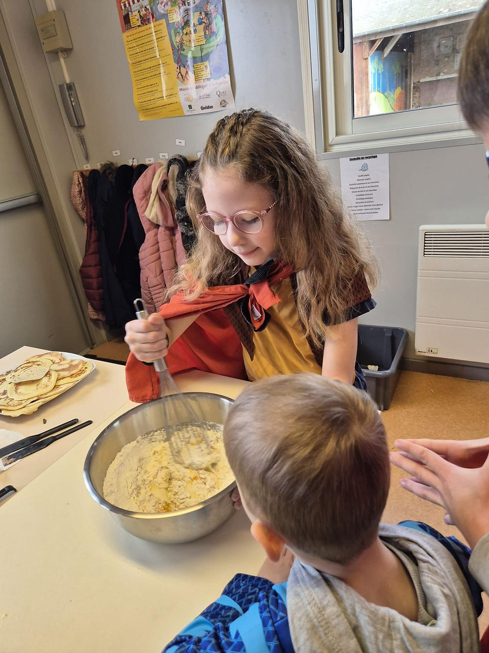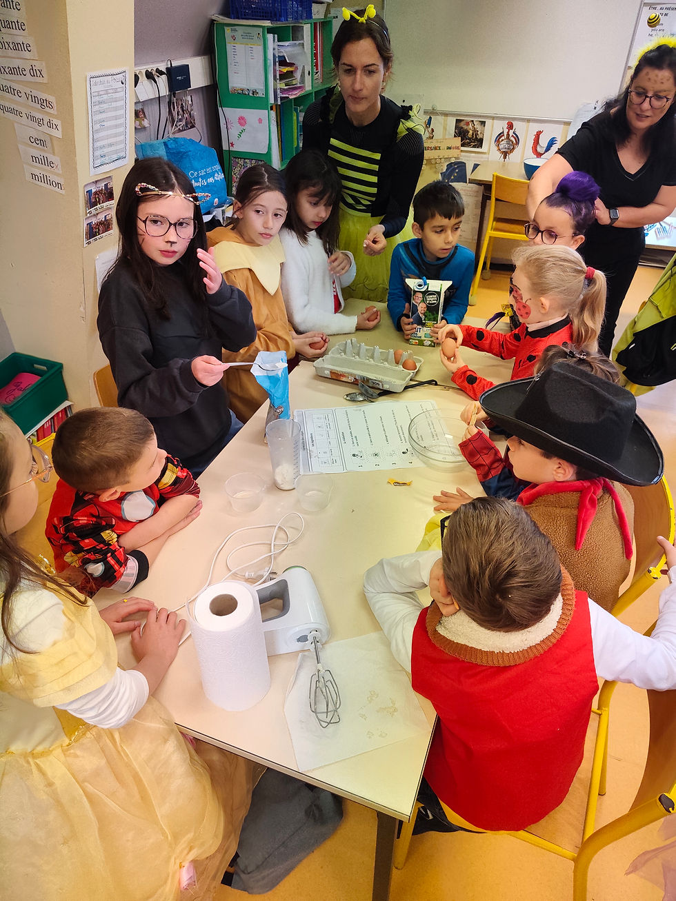 Aujourd'hui, le carnaval s'est invité à l'école. Les enfants ont commencé par la préparation des crêpes. Les élèves étaient mélangés avec les autres élèves des autres classes.