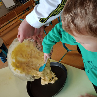 Suite à la lecture de l'album le LOUP qui découvrait les pays des contes, nous avons fait deux gâteaux avec les pommes du verger de Mr LEBOUCHER.